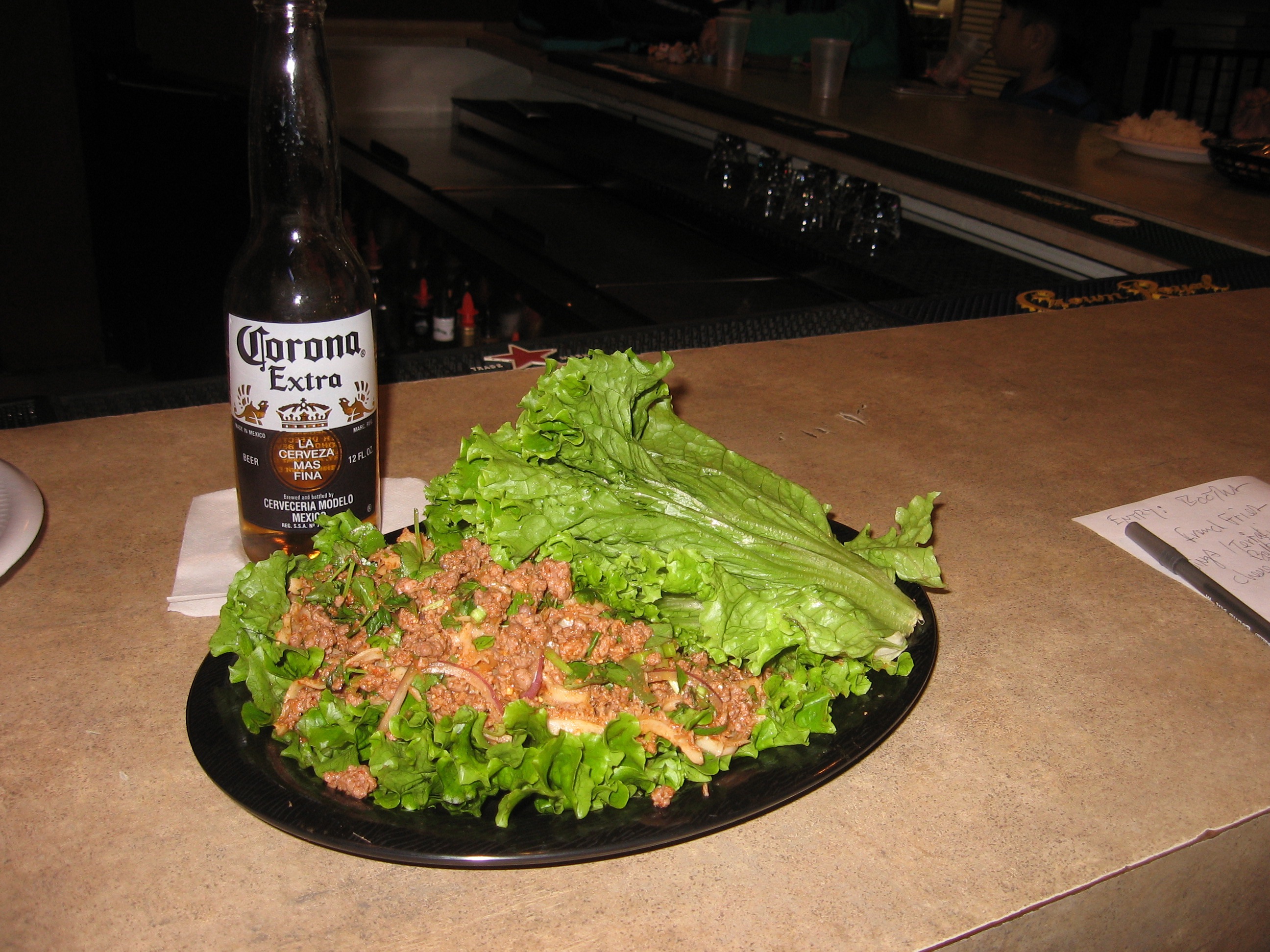 The restaurant is owned by a Hmong family. I was there a couple of years ago for a fundraiser for Fong Hawj, the current East Side Senator. On this day I arrived a tad after 5:00 and the place was not busy. There was only one couple in the dimly-lit front room with seven sizeable booths. It contained a long bar on one side and what appeared to be a spot withstand-up speakers for a DJ or perhaps a setting for karaoke. I entered the second side of the establishment that had seating along a full-service bar and a few tables. There was also a large area with half a dozen pool tables. There are pizzas-not surprising given their name. You can choose from fifteen different toppings. The also have three or four house pizzas. “King Me” which they describe as a “six topping deluxe” of sausage, pepperoni, Canadian bacon, onions mushrooms, and green peppers. And a “Crown Royal” with sausage, beef, pepperoni, Canadian bacon, green olives and ripe olives. There is also a vegetarian option. There are three “Asian items,” as they put it. Hmong sausage with sticky rice, a papaya salad and a third, that I decided to try. My choice was laab, a traditional Hmong food that often served at festive occasions and brought to the East Side from Laos. It has a base of finely chopped meat-either chicken or beef and either raw or cooked served atop a bed of lettuce. I took beef and chose cooked. I could hve spicy but, as a favor to my sometimes-sensitive stomach, I said no. Since the laab had cilantro (as well as mild onions) the dish was a little hot. I had a bottle of Corona beer (with a lime slice) to cool things down.