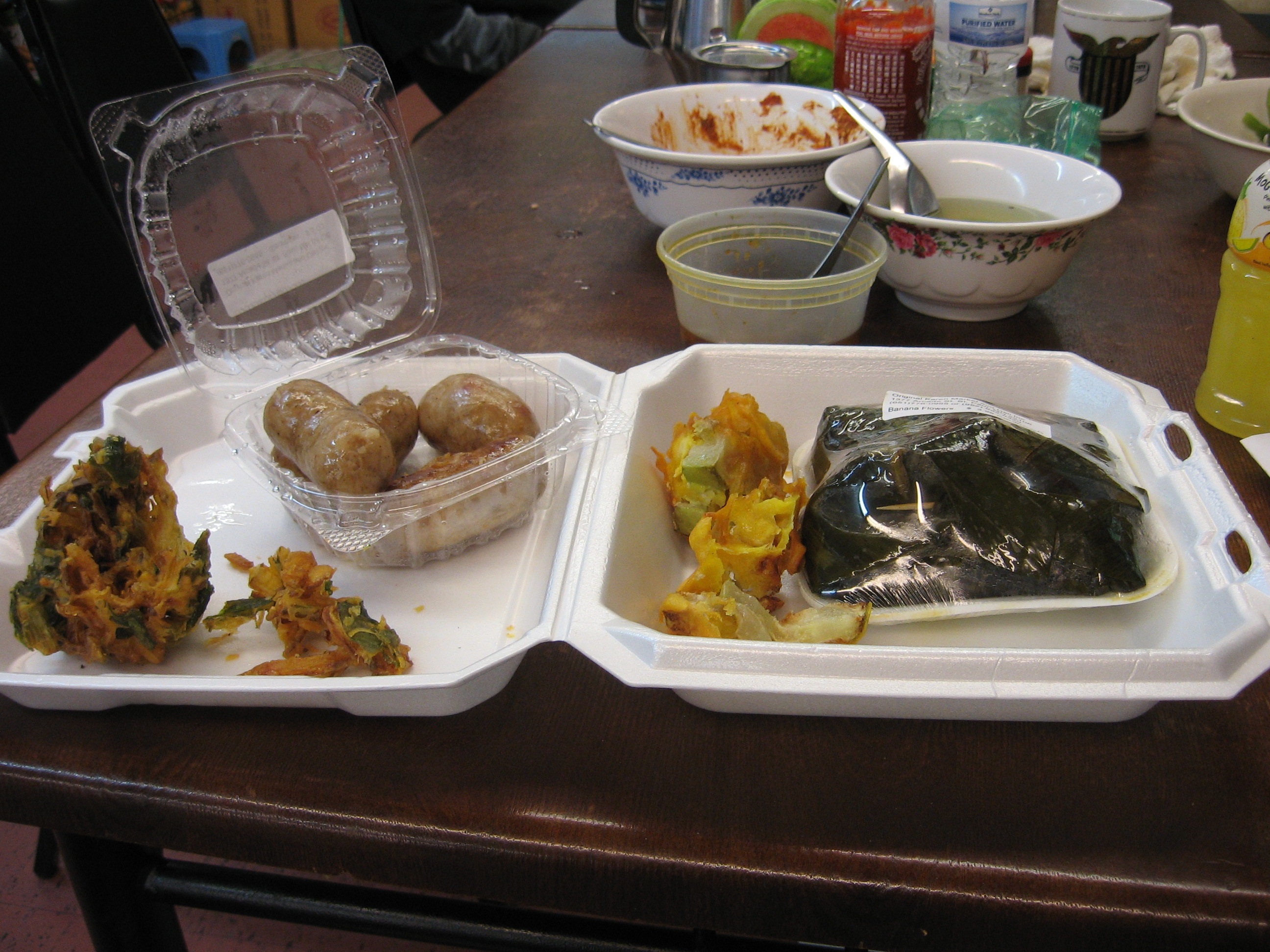 The latest large wave of immigrants to St. Paul are the Karen, an ethnic group inside Burma, a country recently known as Mynamar. They were a persecuted group that coalesced on the East Side. A few years ago one of their families started the original Karen Market, the first Karen grocery store in the country. There are now at least three others. When I recently drove by, the word Deli had been added to their name. This was an investigation to be undertaken during the Taste Trek. This is primarily a grocery store, so this will be a shorter than usual article. Like many other Asian groceries, there are large bags of rice and any number of ethnic items as as well as some more Americanized choices, such as cake mixes, tmato productsmayonnaise and tomato paste. There are no fresh meat products but quite a few kinds of frozen fish and other meats, including bone-in goat meat. There are fresh vegetables of all sorts in stand-up coolers. Inside there was a small kitchen there and two pulled-together tables with eight chairs where a person could sit with deli food. The deli items are limited in number.available but not a large menu. There are two pulled-together tables you can sit at to eat the prepared food after paying at the counter. The business was established and incorported in 2011 and incorporated in Minnesota by a Karen man named Zaw Mine. I bought several kinds of the Karen deli items including two deep fried squash pieces, sausages filled with pork and something they called “Banana Flowers.” The latter was made of mushrooms, onion, garlic and chilli and wrapped in banana leaves. The counter man warned me it would be hot and he ws right. Time for a soothing drink. There were many options inside a cooler. I picked Mogu mogu for a drink. It was a product of Thailand that was pineapple juice that was infused with many small pieces of the fruit. While I was there I saw one of the workers eating a noodle dish that may be available, but who knows since there is no printed menu.