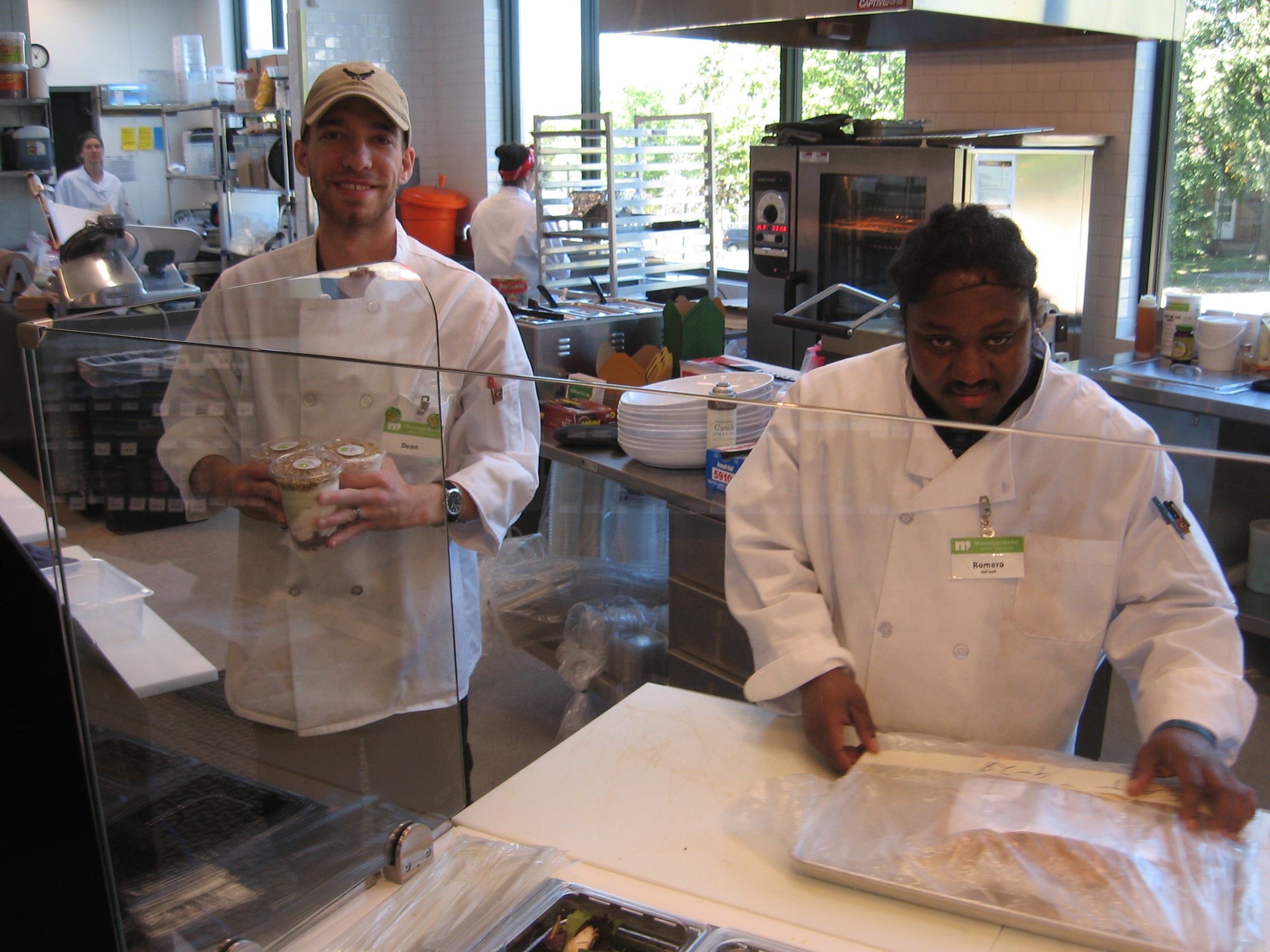 While at an event in Indian Mounds Park, I was given a Mississippi Market coupon for two dollars off a ten-dollar purchase. It was good until September 30th, so I had to hustle off see what was there for lunch. The co-op was a long-time dream that was originally spearheaded by a local group. Then Mississippi Market-which had two other stores-stepped and the hopes were finally realized this year. I know that that the recently-opened natural food co-op had a deli and juice bar addition to groceries so I wanted to check things out. There are five tables with four chairs and a counter seating for ten with a long window that has a clear view of Maple Street. They also have a classroom for public cooking classes, but I was focused on the Taste Trek. Salad makings on a buffet. You choose your own and the weight determines the cost. The hot bar is also a weight-based buffet item. On the day I was there I saw Ethiopian cabbage and carrots, chicken tikka masala, baked salmon patties, roast chicken pilaf, Kung Pao chicken and even childhood favorite mac-and -cheese. There are several Panini sandwiches. Among them, I saw a Creole Club made with creole yams, a salmon cake sandwich and a roast beef and blue cheese. There is a soup bar, with different offerings through the week. Some of the choices at the juice bar include apple zinger as well as coffee au lait, tea and smoothies like cherry lime. Yes, the Market emphasizes healthy food, but that doesn’t mean no sweets. Try peanut butter cookies, apple turnovers, muffins, scones and more. I zeroed in on a Cubano sandwich that was made with Beeler’s ham, Swiss cheese, a pickle spear and home made mustard on New French focaccia roll. I also accompanied it with a small Mango Dreams Peachy smoothie that had added soy milk and cinnamon. When I went to the eating area I ran into the director of the Dayton’s Bluff Block Nurse program and one of my fellow board members and sat with them.