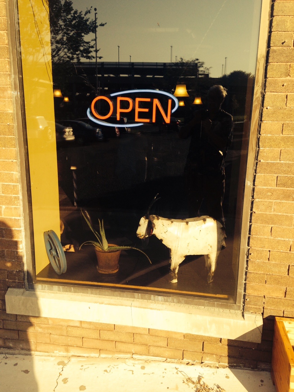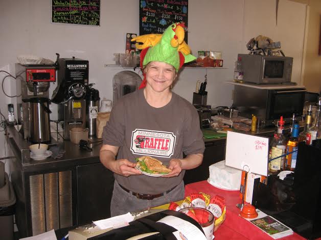 The Dancing Goat’s building was constructed in 1909 by John Doeren for his cigar factory. Their name comes from a legend about an Ethiopian shepherd who noticed the way his goats were jumping around after eating the fruit of a bush. It was the discovery of coffee. I was at a meeting there and decided to stay for lunch. Although it is a coffeehouse, it offers a modest menu of food. Inside there are seven tables, a sofa and two easy chairs. There are a few seats at the counter, behind which is the menu on the wall. You order and pay for the food at that time. There is free Wi-Fi, a large patio and a second story conference room, but there is no elevator. Of course there is a lot of coffee-ten hot drinks like latte and five iced drinks. Drinks other than coffee include hot chocolate, soy or almond milk “kiddy cocoa” and a large number of smoothie flavors. “Early Bird Specials” include 20% off all beverages and $1.00 off many sandwiches. There is a Happy Hour from 4:00 PM to 7:00 PM with 20% off all coffee beverages. Here are some of their sandwich offerings: “The Bluff,” a turkey, zucchini, tomato and provolone and “Veggi Vento” with hummus, cucumber, zucchini tomato spring mix—a fancy name for a combo of lettuce and spinach- and provolone. They have a number of “bagelwiches” and “B-Fast wraps”, some salads and soups. Want something sweet? There are cookies, brownies, bars banana bread, biscotti and parfait. I decided to have an “East Sider,” a sandwich comprised of roast beef, onion, cheddar cheese, spring mix and a horseradish sauce. I added a banana strawberry smoothie. Too early for beer plus they don’t even have any. While I was there, Tom O’Connell walked in and we enjoyed chatting about the old days of teaching together at Minneapolis Community College and Metro State as well and discussed some of our current shared ventures.
