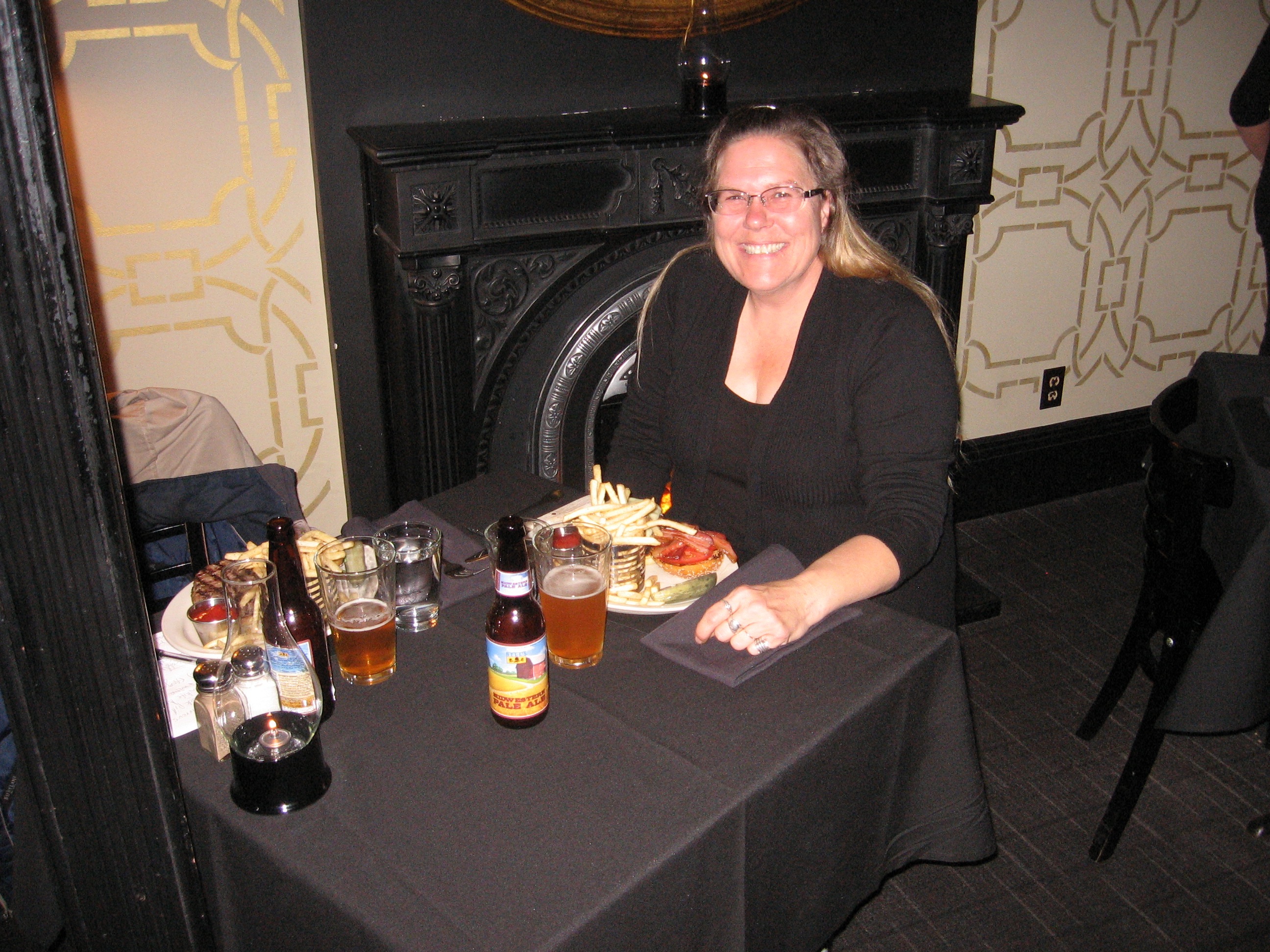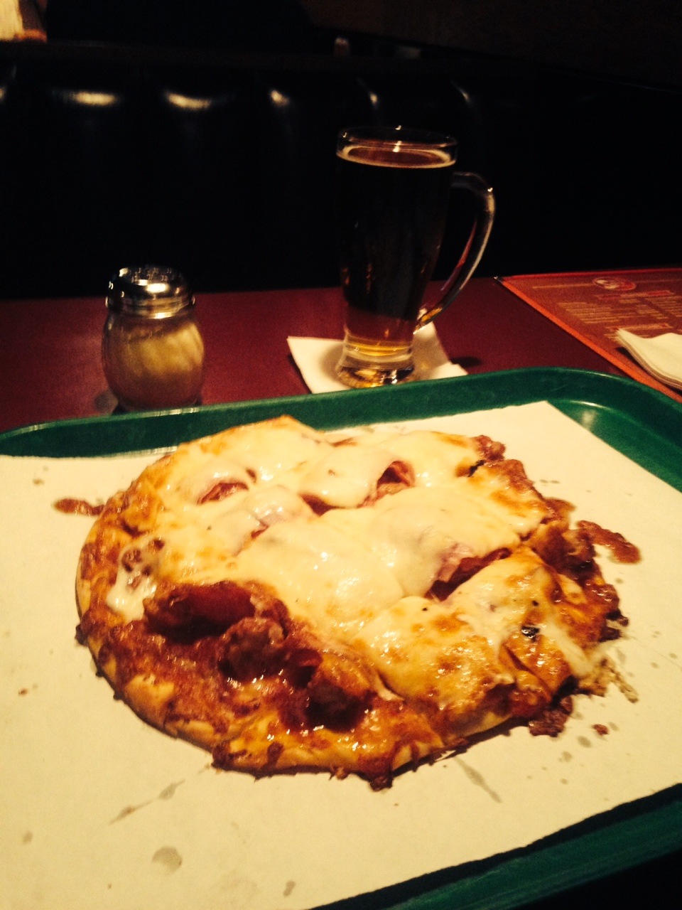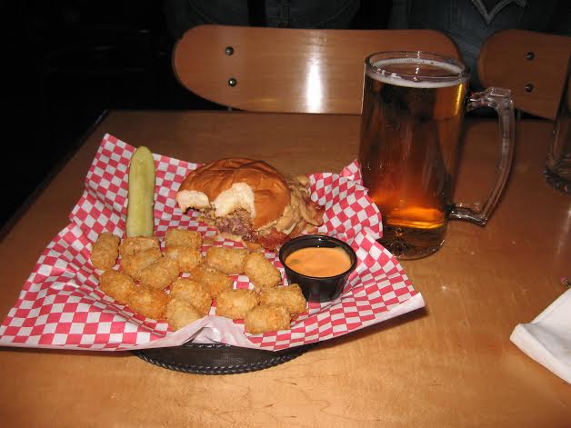 Had a notion to chow down on a little bar food, so I headed east on I-94 went north on White Bear Avenue to Minnehaha. I wasn’t sure what I would find, but discovered a more complete menu than expected. There was a full house at 7:30, with a casual crowd where blue jeans were quite evident. There was a rectangular bar with wine and liquor, featuring ten beers on tap and others in bottles. There were maybe thirty stools filled by a diverse crowd and a dozen or more tables. On that night, three different televisions featured professional sports-hockey basketball and baseball. With a jukebox going, it was pretty loud. There is also a sizeable party room in a finished basement. A raised area at the back has pool tables and a dartboard. There is a pulltab booth inside and a large outdoor patio. Appetizers include wings, curds, and pot stickers. There are some salads and wraps. Sandwiches feature “hot dagos,” Reubens and barbequed pork. There are many kinds of tacos, many well known and others like the wonton taco that sound more unusual. There are an amazing twenty different kinds of burgers. “Signature items,” such as the bleu and bacon burger, are marked with little red cherries. I decided to try something new—a bacon and peanut butter burger with hot pepper cheese for what was said to provide a sweet and salty taste. I selected tater tots instead of fries or chips. The motto of the establishment that was chosen by owner Nicole Cherry is “waiting for food is the pits,” and even though it was crowded, my food came fairly quickly, even before I was done with my beer.